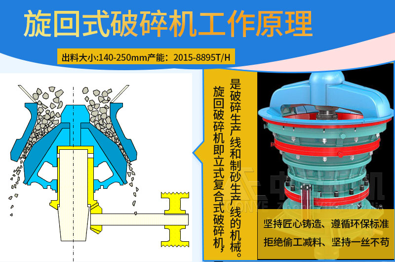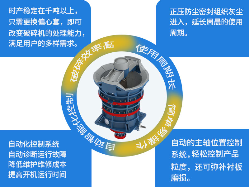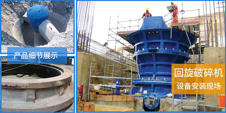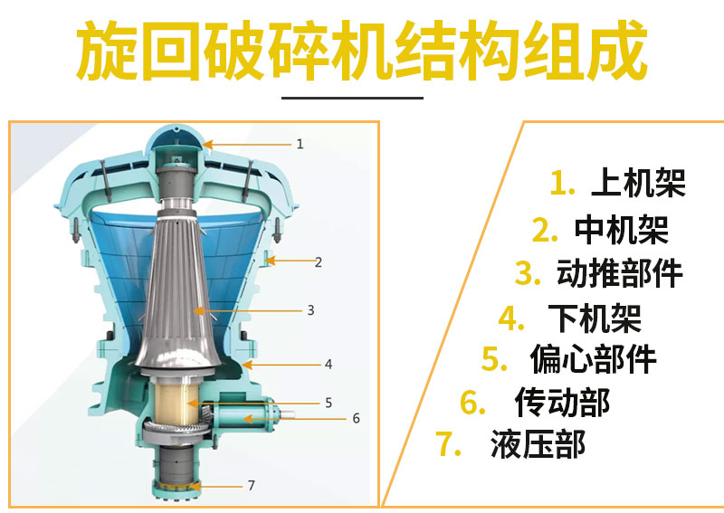 旋回式破碎機主要由橫梁部、上中下機架部、動錐部、偏心套部、傳動部和液壓缸部等組成.在設備工作時,由電動機帶動水平軸旋轉,水平軸通過齒輪帶動偏心套旋轉,再由偏心套帶動動錐部做圓周擺動,從而實現(xiàn)連續(xù)的擠壓破碎石塊。可通過調節(jié)動錐底部的液壓缸改變排礦口的大小,方便調整產品粒度;同時液壓缸也提供過鐵保護功能,當有不能破碎的物體進入破碎腔時,液壓缸能自動使動錐下落釋放物體,保護破碎機。