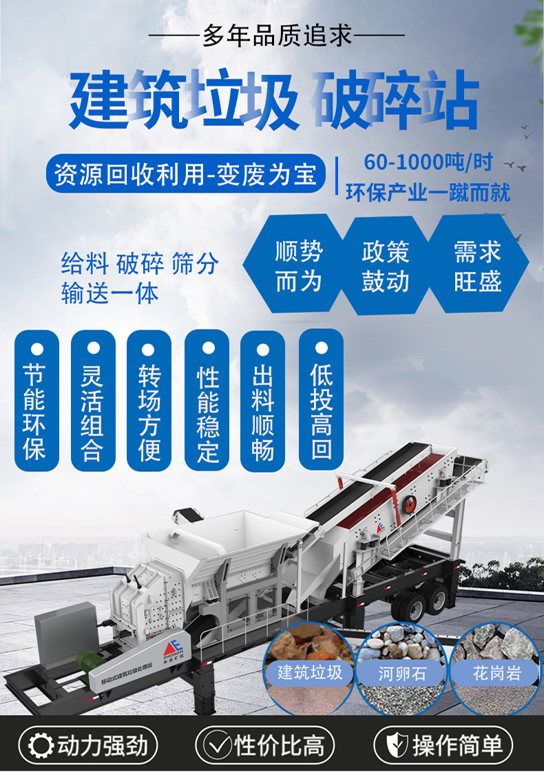 鄭州中意礦山機(jī)械有限公司曾研制國(guó)內(nèi)的建筑垃圾處理設(shè)備YPC移動(dòng)式破碎篩分站,其長(zhǎng)度十多米,建筑垃圾回收利用率達(dá)95%,它的出現(xiàn)改變了用鄂破和反擊破來(lái)破碎建筑垃圾的傳統(tǒng)方式,對(duì)鋼筋和混凝土分離徹底,關(guān)鍵的是設(shè)備的除塵降噪音裝置,讓整個(gè)建筑垃圾回收再利用過(guò)程無(wú)揚(yáng)塵、無(wú)噪音,真正的綠色安全設(shè)備。